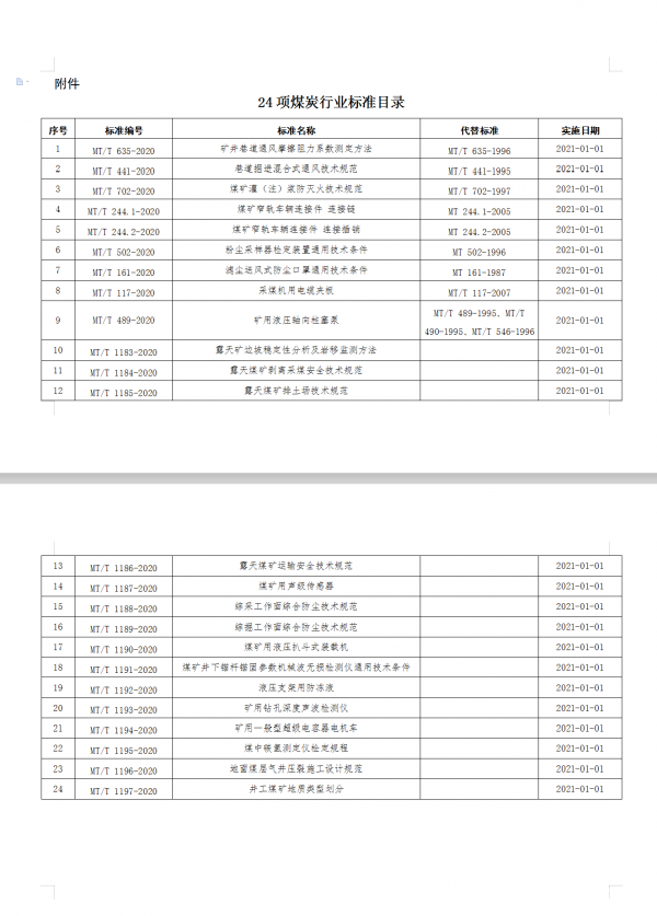 國家煤礦安全監察局批準24項煤炭行業標準(目錄見附件),自2021年1月1日起施行,現予公告。