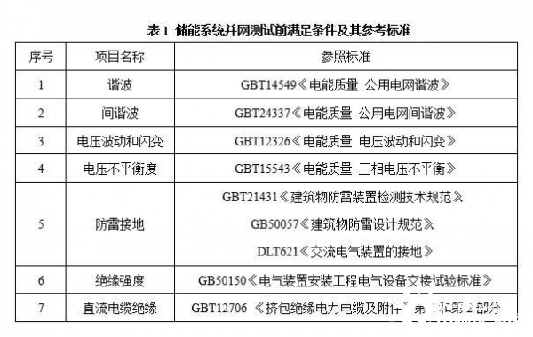 基本條件對電化學儲能系統(tǒng)的防雷接地裝置、接入點設(shè)備的絕緣強度和耐壓以及接入點電網(wǎng)的電能質(zhì)量等進行了規(guī)定。具體參照的標準如表1所示。