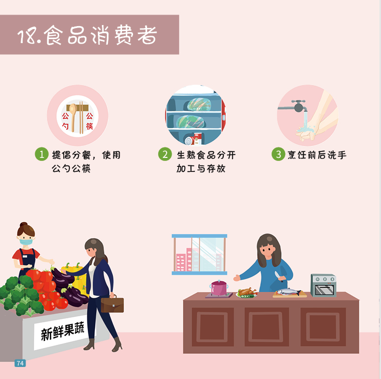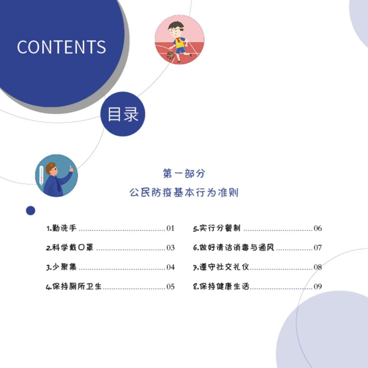 《公民防疫行為準(zhǔn)則》(科普版)共三部分73類。 第一部分為公民防疫基本行為準(zhǔn)則,包括勤洗手、戴口罩、少聚集、分餐制、社交禮儀以及廁所衛(wèi)生、通風(fēng)與消毒、健康生活等八方面; 第二部分和第三部分針對重點場所、重點人群主動防疫的關(guān)鍵風(fēng)險點,對不同場景、不同人群提出健康防護(hù)準(zhǔn)則。 旨在通過圖文并茂、貼近生活的形式,讓公眾看得懂、易接受、記得牢、做得到,將公民防疫行為準(zhǔn)則作為一種社會文明風(fēng)尚和健康生活方式,持久地堅持下去、推廣開來。