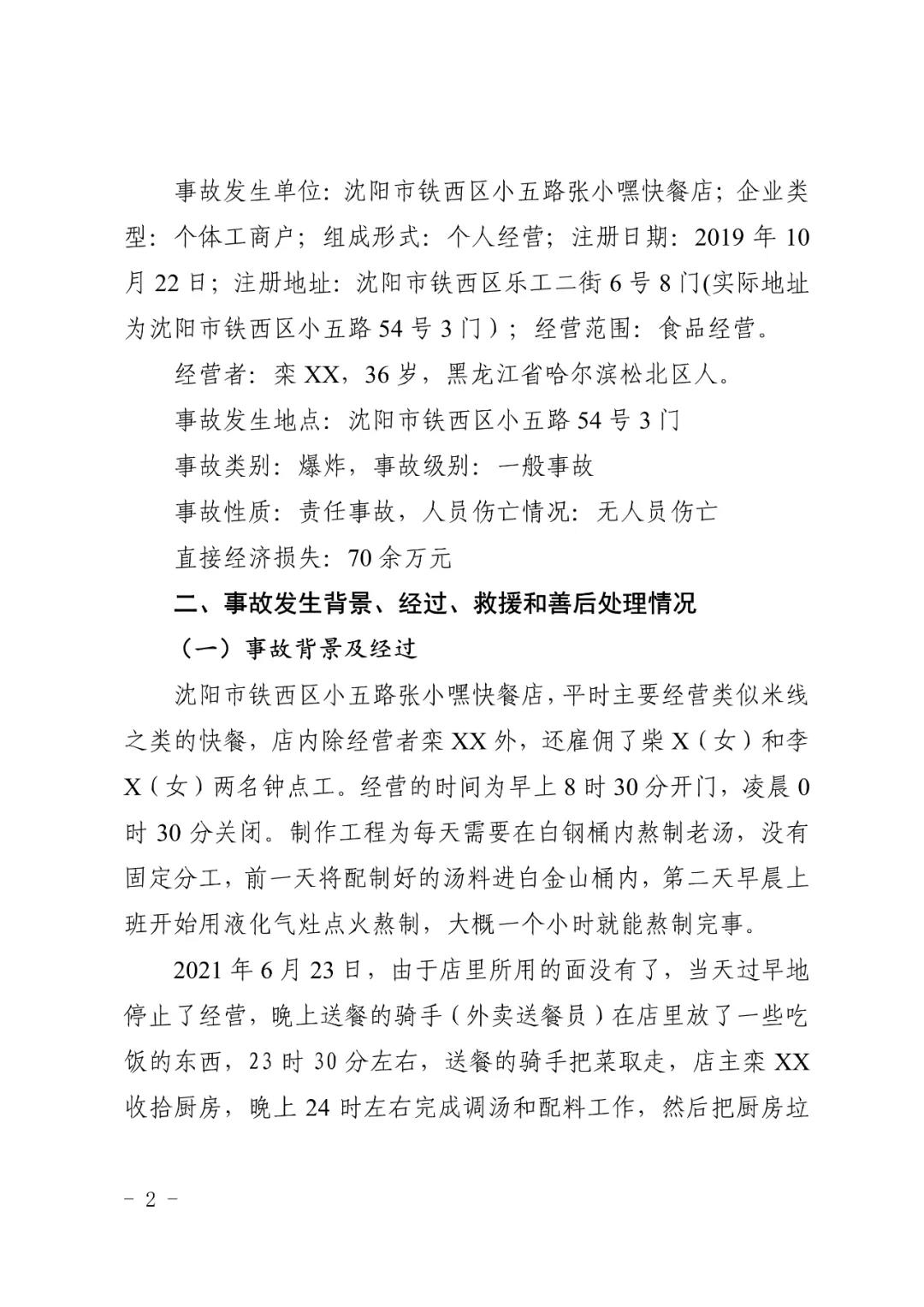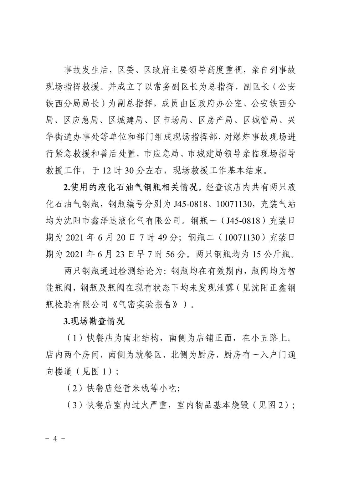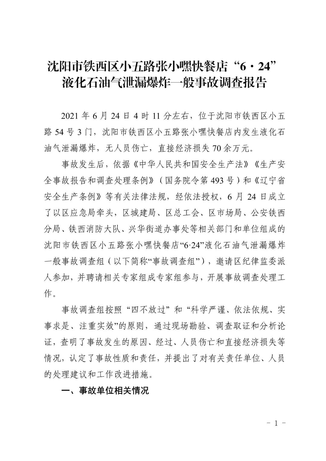 2021 年 6 月 24 日 4 時 11 分左右,位于沈陽市鐵西區小五路 54 號 3 門,沈陽市鐵西區小五路張小嘿快餐店內發生液化石油氣泄漏爆炸,無人員傷亡,直接經濟損失 70 余萬元。