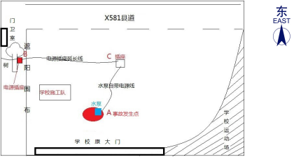約9時(shí),馮建威先到達(dá)現(xiàn)場(chǎng)查看情況,協(xié)調(diào)借用抽水泵和處理其他維修點(diǎn)工作。隨后,薛柏林、趙文輝駕駛工程車到達(dá)耕管村附近,將一些工具和材料送給附屬施工隊(duì)【1】后,約9時(shí)20分到達(dá)該爆水管處。兩人經(jīng)商量決定先抽走水坑里的水再檢查和維修水管。薛柏林駕駛工程車向附近(約500米外)作業(yè)的附屬施工隊(duì)借回一臺(tái)潛水泵(規(guī)格為3寸220V)和一根普通電源插座延長(zhǎng)線,回來(lái)后將潛水泵放進(jìn)水坑中。趙文輝和薛柏林向?qū)W校維修項(xiàng)目工地(靠學(xué)校操場(chǎng)跑道側(cè))借用臨時(shí)用電,將連接潛水泵的電源插座延長(zhǎng)線插在工地施工用的排插上,啟動(dòng)后發(fā)現(xiàn)潛水泵不運(yùn)行,兩人徒手搖晃潛水泵并調(diào)整插頭,發(fā)現(xiàn)潛水泵仍不運(yùn)行。經(jīng)詢問(wèn)現(xiàn)場(chǎng)施工人員及剛好經(jīng)過(guò)的學(xué)校保安林建軍,得知樹(shù)下還有一處借電點(diǎn),保安林建軍未經(jīng)請(qǐng)示校領(lǐng)導(dǎo)同意擅自協(xié)助兩人將電源插座延長(zhǎng)線直接插到樹(shù)上排插上,此時(shí)潛水泵還是不運(yùn)作,趙文輝和薛柏林懷疑潛水泵可能有故障或者是有雜物堵塞。約9時(shí)45分,趙文輝走向C處查看插頭是否松動(dòng)時(shí),薛柏林則用雙手徒手檢查潛水泵故障,不慎發(fā)生觸電。此時(shí),馮建威已回來(lái)在一旁與上橫中心小學(xué)的張志老師交談,突然聽(tīng)到薛柏林發(fā)出“觸電”的叫聲,隨即跌倒在地,雙腳落入水坑中。趙文輝立馬拔掉潛水泵自帶電源線的插頭,薛柏林掙扎爬到水坑邊臉朝下趴在地上,臉色發(fā)白,處于昏迷狀態(tài)。