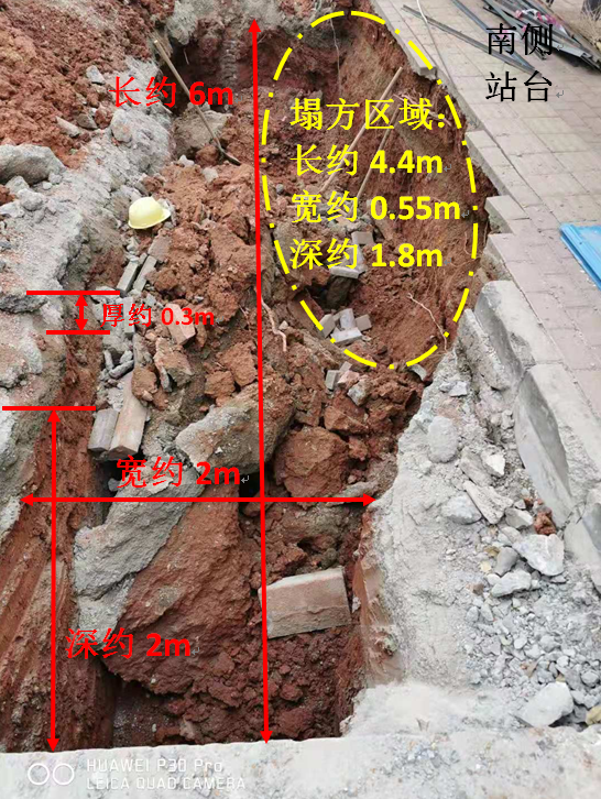 溝槽南側惠豐城公交站臺鋪磚區下方基坑側壁有坍塌現象,塌方長度約為4.4m,寬度約0.55m,深度約1.8m,溝槽北側龍海二路硬化路面處完好。(見圖二)
