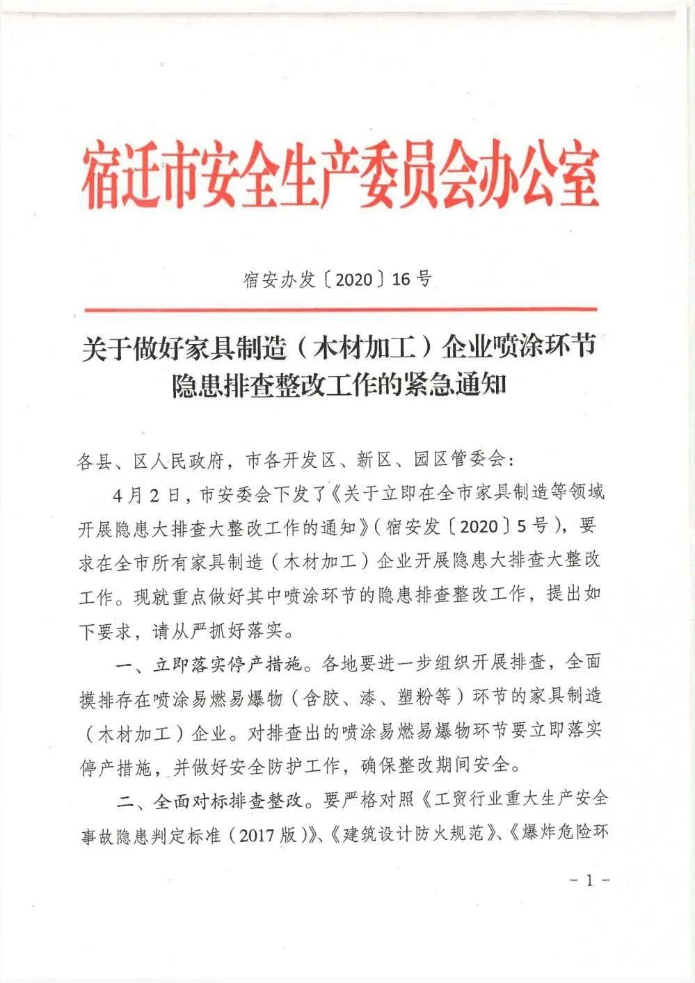 宿遷安監(jiān)消息:近日,宿遷市安委會(huì)連續(xù)發(fā)出5號(hào)、6號(hào)文件,安委辦發(fā)出16號(hào)文件,要求開(kāi)展專(zhuān)項(xiàng)治理。安委辦16號(hào)文件特別提出要重點(diǎn)做好家具制造噴涂環(huán)節(jié)的隱患排查整改工作。