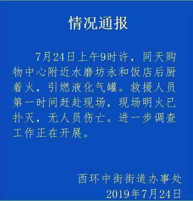7月24日上午9時(shí)許,同天購物中心附近水磨坊永和飯店后廚著火,引燃液化氣罐。救援人員第一時(shí)間趕赴現(xiàn)場,現(xiàn)場明火已撲滅,無人員傷亡。進(jìn)一步調(diào)查工作正在開展。