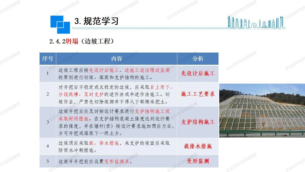 (4)基坑、土石方挖土?xí)r土壁按規(guī)定留設(shè)邊坡,嚴(yán)格按照設(shè)計(jì)坡度進(jìn)行放坡開挖,進(jìn)行有效支護(hù)和排水,并設(shè)置專人對(duì)邊坡穩(wěn)定性進(jìn)行檢測。基坑應(yīng)基坑頂邊緣1m范圍內(nèi)禁止堆放材料。