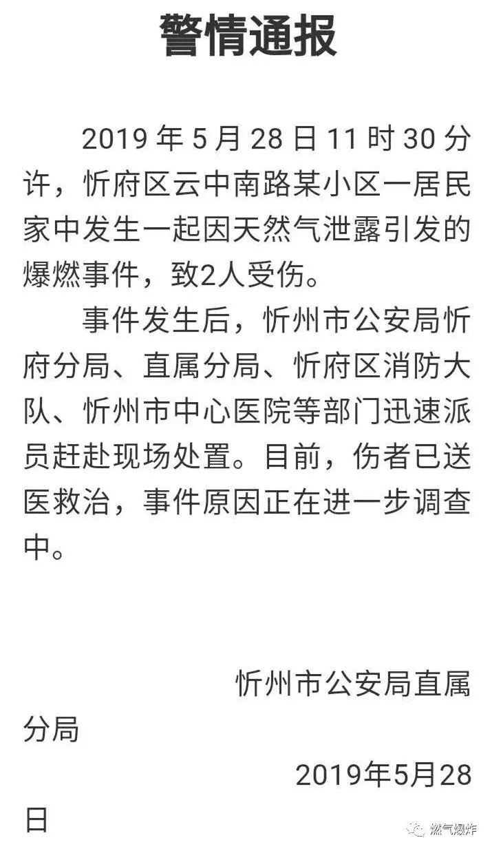 月28日11時30分許,忻府區云中南路某小區一居民家中發生一起因天然氣泄漏引發的爆燃事件,致2人受傷。