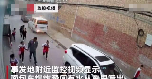 事發地附近監控顯示,面包車爆炸瞬間有火從車里噴出,而在爆炸前一秒小學生剛剛從車旁經過。