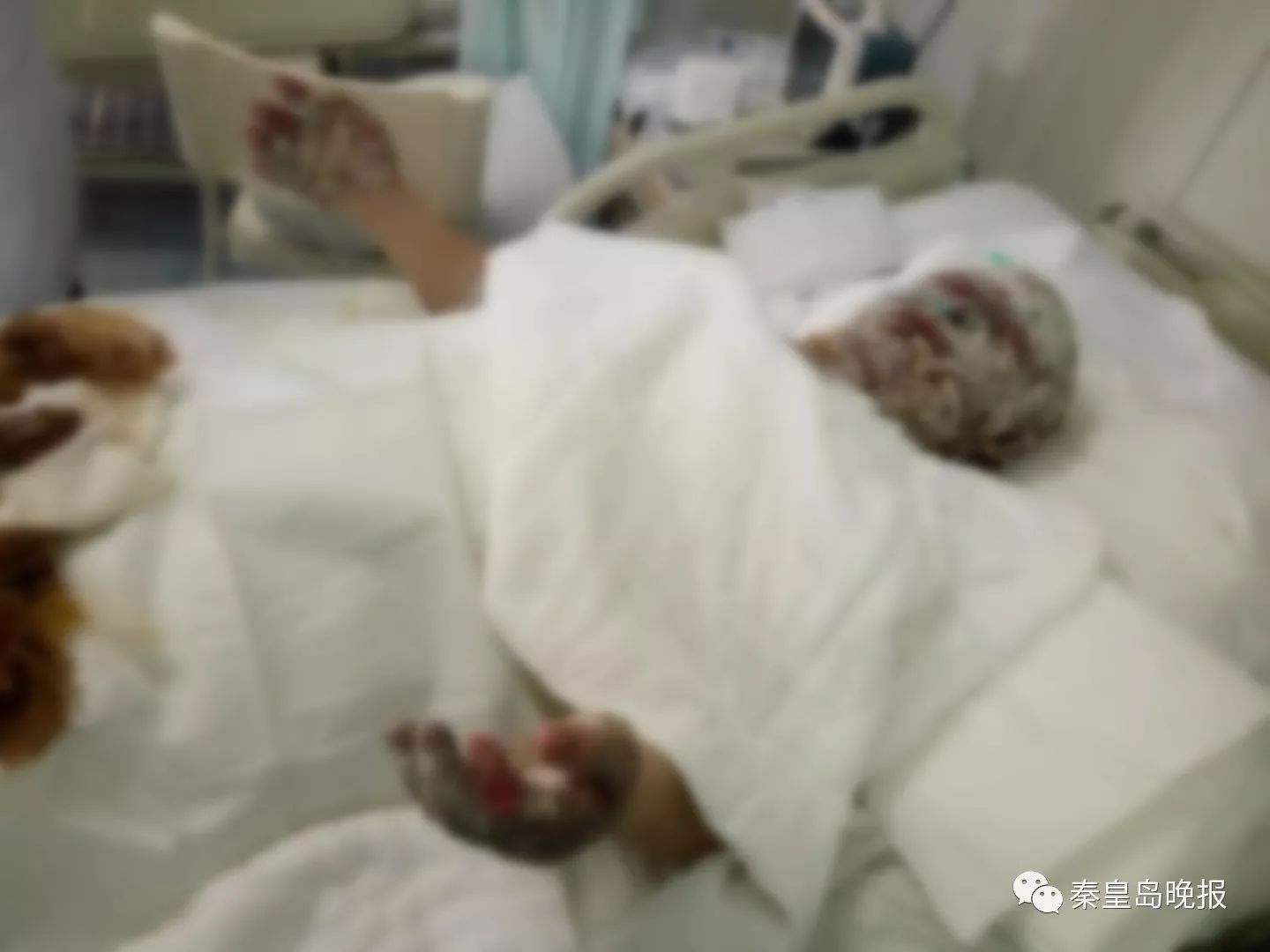 在這間潔凈、有著精密治療儀器的病房里,李偉鵬父母的病床是相鄰的4床和5床,中間只隔著1條1米多寬的通道。愛漂亮的母親沒了滿頭秀發,臉上布滿燒傷痕跡,裸露在外的皮膚都纏裹著厚厚的紗布。曾經意氣風發的父親五官腫脹變形,眼睛腫成一道縫。