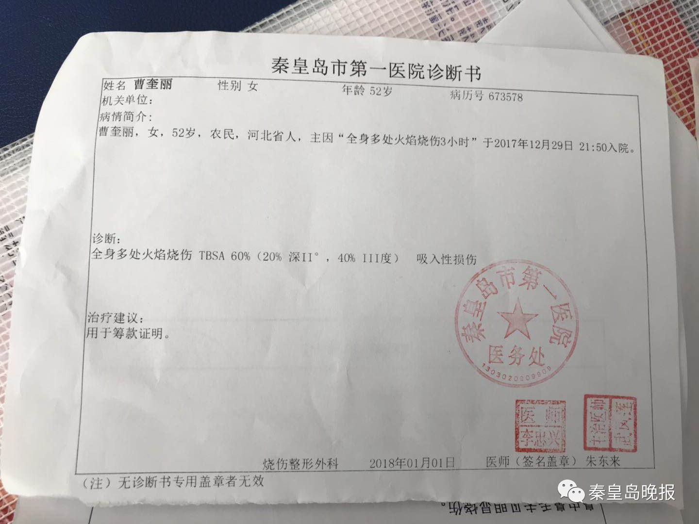 2017年12月29日晚6點多,他突然接到老家鄰居打來的電話,讓他趕緊回家。還沒往家走,電話又響了,這次讓他趕緊去醫院掛號。鄰居沒說發生什么事兒,可從那驚慌失措的聲音中,李偉鵬有種不祥的預感。直到兩個小時后,看到了躺在醫護人員擔架上奄奄一息的父母,他才知道這事兒有多大。父母全身都是觸目驚心的燒傷,皮膚都燒焦了,已不是他熟悉的樣子。長大后很少哭的李偉鵬,那一刻沒能忍住眼淚。后來,清醒過來的父母向他講述了事發時的情況。當時,母親在二樓臥室,突然聽到廚房有聲響,過去一看是一個小型煤氣罐裂縫了,整個廚房都是煤氣味兒。“她把門窗打開散味兒,可能想散得快點兒,又拉開了排風扇?!本褪沁@個不經意的舉動,瞬間帶來了致命的災難——煤氣爆炸起火,肆虐的火舌瞬間席卷了站在廚房正中央的母親。渾身是火的母親忍著劇痛爬到水池邊自救,站在門外的父親也被炸傷,直到鄰居聞訊趕來將二人救起。“我爸輕點兒,燒傷的主要是手臂和腳腕。我媽嚴重,全身60%燒傷?!崩顐i說,腳腕是母親傷得最輕的地方,她當天穿著一雙高筒靴子,幫她擋掉了一些災難。事發后,李偉鵬沒回過家,他在表哥的手機上看到了自家小飯店的慘狀,“整個廚房都炸飛了,屋頂都沒了,玻璃都碎了。”