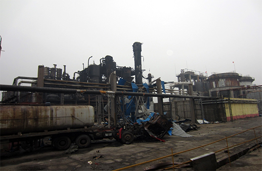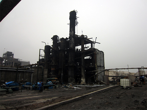 | 8月25日 | 18:46:22 | 氧化塔爆炸,并相繼引燃了氧化塔周邊氫化塔、萃取塔等設(shè)備中的物料。爆炸導(dǎo)致在四層平臺(tái)取樣的張某、一層北側(cè)檢查的秦某和程某當(dāng)場死亡;并導(dǎo)致雙氧水車間南300米的氯堿車間氯氣管道受損,造成少量氯氣泄漏;爆炸碎片和泄露的氯氣導(dǎo)致雙氧水車間辦公室朱康康,中控室鄭某、金某、秦某,氯堿車間荊某、秦某和水泵房張某等7人受傷。 |