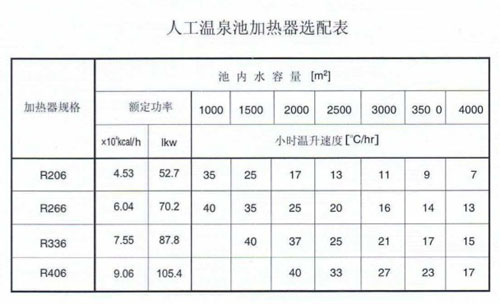 如果你的人工溫泉池還沒有選配加熱器,請先確認你溫泉池的規格并計算出池內水容量,根據池內水容量和你的溫升要求,查下表即可確定加熱器規格。