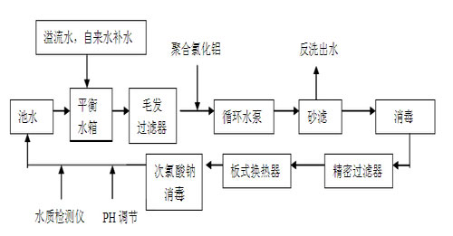 本設(shè)計(jì)泳池的進(jìn)回水方式,采用淺水端池壁進(jìn)水、深水端池底回水和池面排水相結(jié)合的順流循環(huán)方式,采用這種方式,既能有效去除沉積于底部的污物,又可去除浮于水面的毛發(fā)及其它輕質(zhì)漂浮物。保證了全池水質(zhì)的均勻。工藝流程圖如下圖所示: