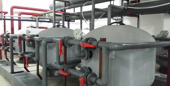 一、循環(huán)水凈化處理設(shè)備機(jī)房的位置應(yīng)靠近游泳池的周邊,以減少游泳池與游泳池凈化設(shè)備機(jī)房間管道往返的長度,改善水力條件;