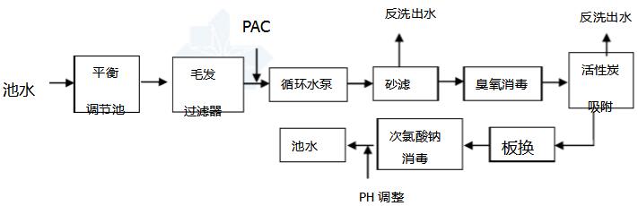 將水中毛發(fā)、大的懸浮物截留住,以免毛發(fā)纏繞泵的葉輪,影響后繼設(shè)備運(yùn)行;出水加入混凝劑后,在管道內(nèi)發(fā)生混合反應(yīng),將水中微小懸浮物凝聚,產(chǎn)生礬花經(jīng)高速過濾器后經(jīng)石英砂過濾器截留;后經(jīng)過臭氧消毒,后的水通過活性炭吸附去除水中剩余的臭氧,經(jīng)過換熱器,使水溫達(dá)到相應(yīng)要求;此時加入消毒劑,以殺滅水中細(xì)菌,保持一定的余氯量,然后池水重新回到泳池。