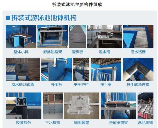 拆裝式游泳池又稱活動泳池或拼裝式游泳池、拼裝泳池;也是近些年市場涌現(xiàn)出的一種新型游泳池產(chǎn)品。其原理是在工廠完成所有標(biāo)準(zhǔn)構(gòu)件的定制生產(chǎn)、采用現(xiàn)場拼裝作業(yè)方式完成各種規(guī)格游泳池設(shè)施的組裝建設(shè)。拆裝式游泳池可以根據(jù)用戶使用需求快速安裝于大多數(shù)符合要求的簡單平整場地、相對于普通土建游泳池而言具有顯著的場地適應(yīng)性和反復(fù)安裝拆卸特性,故命名為拆裝式游泳池。按照國家標(biāo)準(zhǔn),拆裝式游泳池應(yīng)該能夠提供普通游泳場館的所有訓(xùn)練與比賽功能要求。