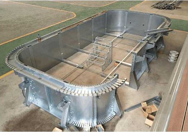 拆裝式泳池是由池體和游泳池水處理系統(tǒng)兩部分組成。池體由鋼架主體結(jié)構(gòu)、內(nèi)壁承壓防水、外壁裝飾、圍池過道、四周護(hù)欄等幾部分組成。一般拆裝式泳池池體的鋼構(gòu)采用Q-235型熱軋鋼框架結(jié)構(gòu),以高強(qiáng)度螺栓連接,鏈接螺栓為8.8級,M-14。鋼結(jié)構(gòu)框架、鋼結(jié)構(gòu)溢水槽經(jīng)過鍍鋅防腐處理,表層還有兩層防腐處理,一層防銹,二層防腐。溢水槽上方一般鋪設(shè)溢水格柵,常用寬度規(guī)格有250mm、300mm、400mm等幾種,可根據(jù)不同需要進(jìn)行選擇。內(nèi)壁承壓板一般為300mm*30mm、單皮厚度為2.5mm的PVC中空板材或者1.5mm的鍍鋁鋅鋼板,泳池防水層厚度為1.2mm的具有抗拉加強(qiáng)筋的進(jìn)口泳池專用膠膜組成,且膠膜采用高頻焊接制作。外壁裝飾和圍池過道均由優(yōu)質(zhì)pvc材料制作而成,美觀耐用。四周護(hù)欄采用不銹鋼或者碳鋼噴涂材料制成。泳池水處理系統(tǒng)根據(jù)泳池蓄水量配置,處理效果可達(dá)到《國際泳聯(lián)(FINA)游泳池水質(zhì)衛(wèi)生標(biāo)準(zhǔn)》。
