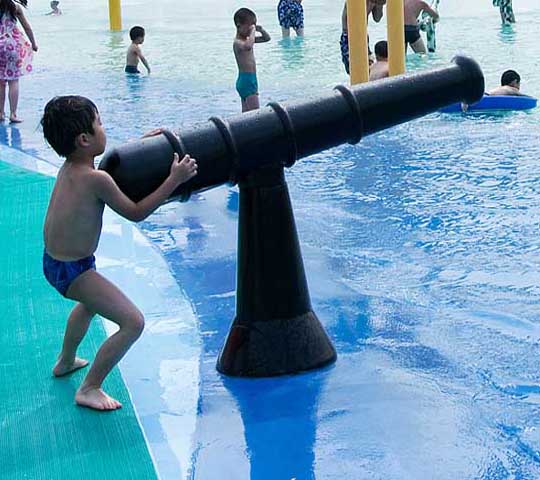 水炮上有一個(gè)機(jī)關(guān),按下去就會(huì)射出一條長(zhǎng)長(zhǎng)的水線。深受大小朋友歡迎的戲水設(shè)備。