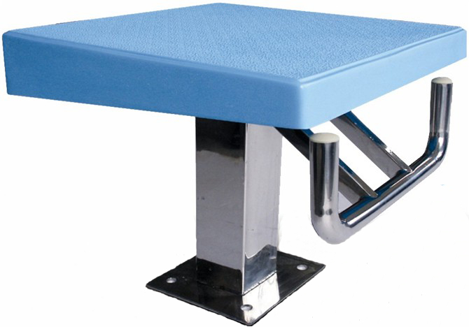 跳臺為游泳比賽專用出發臺符合游泳比賽標準,為一級出發臺,出發臺面為玻璃鋼材質,表面有防滑材料。顏色為淺藍色,和泳池水的顏色非常接近,非常美觀。底座為304不銹鋼,比傳統出發臺更具耐腐蝕性。