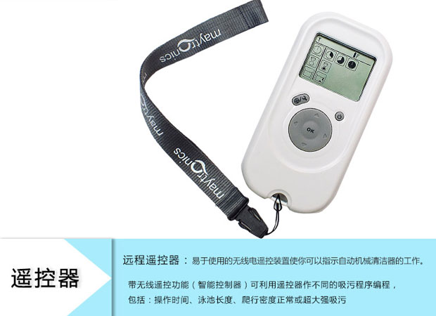 2、可利用遙控器作不同的吸污程序編程,包括:操作時(shí)間、泳池長度、爬行密度正常或超大強(qiáng)吸污等等。